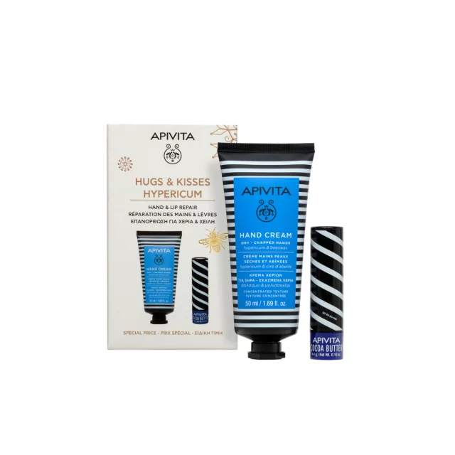 Set za obnovu i zaštitu suhe i oštećene kože ruku i usana. Sadrži Apivita kremu za suhe i oštećene ruke sa kantarionom i pčelinjim voskom (50 ml) te Apivita balzam za usne s kakao maslacem i SPF 20 (4,4 g).