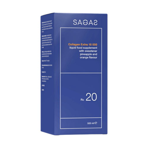Sinergija Naticol kolagena i aktivnih sastojaka koja doprinosi poboljšanju elastičnosti i čvrstoće kože, smanjuje vidljivost i pojavu bora, štiti stanice od oksidativnog stresa, hidratizira kožu i pospješuje mladenački izgled.* Sagas Rc 20 Collagen Extra 15 000 tekući je dodatak prehrani koji sadrži 15000 mg Naticol hidroliziranog morskog kolagena, hijaluronsku kiselinu, elastin MSM (metilsulfonilmetan), koenzim Q10, vitamin C, E, A i D te cink i selen koji dugoročno doprinose ljepoti vaše kože.* – Visoka koncentracija od 15000 mg kolagena – Visoka bioraspoloživost i učinkovitost – Naticol patentirana formula – Snažna sinergija klinički dokazanih sastojaka – Tekući dodatak prehrani bogatog okusa ananasa i naranče * Vitamin C doprinosi normalnom metabolizmu stvaranja energije. Vitamin C doprinosi normalnom stvaranju kolagena za normalnu funkciju desni, hrskavice, kostiju, kože, krvnih žila i zubi. Vitamini C, E i cink doprinose zaštiti stanica od oksidativnog stresa. Vitamin A doprinosi održavanju normalne kože, sluznica i normalnog vida. Cink doprinosi normalnoj sintezi proteina i DNA. Cink doprinosi održavanju normalnih kostiju, kose, kože, noktiju i vida.